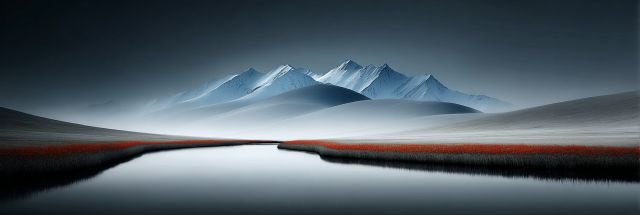 In an enchanting fusion of nature's artistry, the serene beauty of a mountainous landscape unfolds under a radiant morning sky. As dawn breaks, the sun casts its warm hues across the snow-capped peaks, creating a mesmerizing contrast against the crisp, blue expanse above. Below, an endless meadow stretches toward the horizon, its surface a tapestry of vivid red moss interrupted only by the subtle gleaming of a narrow water body mirroring the heavens. This majestic reflection creates an illusion of infinite depth, blurring the boundaries between reality and reflection. The foreground, covered in a lush carpet of orange and green grassland, transitions gradually into the vivid red, offering a visual feast that celebrates the changing seasons. Amid this natural splendor, the air is crisp and filled with the fresh scent of autumn, inviting the observer to pause and breathe in the tranquility. The intricate details of the landscape—each blade of grass, the ripple on the water, the texture of the moss—are rendered with exquisite precision, capturing the essence of this ephemeral moment with clarity and emotion. This image, a testament to the power of professional photography, brings the viewer into a deep appreciation for both the quiet grandeur of nature and the refined craft of image making.