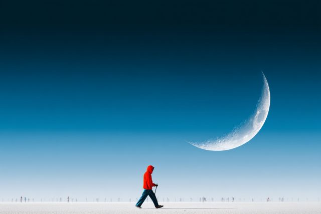 "Lunar Journey: A Solitary Walk Beneath a Crescent Moon"