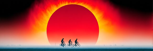 Sunset Cyclists Against a Giant Fiery Sun: A Surrealist Journey