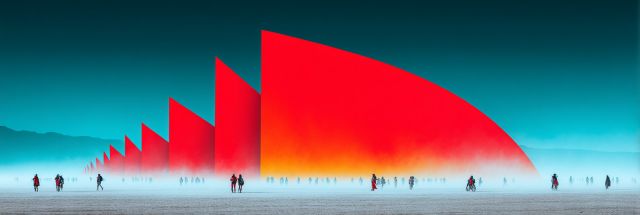 Amidst the vast expanse of a stark, desolate desert landscape, towering crimson peaks emerge, slicing through the cobalt hues of the sky in a breathtaking display of color and form. The artwork captivates with its fusion of natural and surreal elements, presenting an imaginative scene reminiscent of the iconic Burning Man festival. Silhouettes of people, tiny against the monumental installations, wander through the haze that blankets the ground, adding a layer of mystery and depth to the scene. The juxtaposition of vibrant red structures against the serene blue backdrop creates a visually arresting contrast that beckons the viewer into a world that transcends the ordinary. As the eye travels across the canvas, the peaks appear to multiply towards the horizon, suggesting infinity and echoing the boundless creativity of human expression found at cultural gatherings like Burning Man. This piece not only decorates a wall but also invites contemplation about the intersections of nature, art, and community.