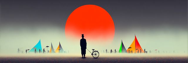 Amidst a canvas blanketed by twilight colors, a surreal scene unfolds where the boundless energy of a festival meets the tranquility of sunset. In the distance, a colossal sun, radiant and fiery orange, sinks towards the horizon, casting a glow that bathes the landscape in warm, golden hues. Closer to the foreground, an enigmatic figure stands beside a bicycle, his silhouette sharply outlined against the oversized sun. His presence is both solitary and striking amidst the simplicity of the sparse landscape.