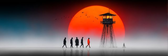 A Mystical Journey at Dusk: Silhouettes Against a Fiery Red Sun