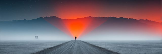 As the horizon unfolds, an enthralling scene captures the essence of adventure and infinite possibility. An open road stretches endlessly, inviting onlookers to venture into a breathtaking landscape dominated by mist and the soft pre-dawn light. Here, the world seems paused at the cusp of daybreak, where the cold blue of predawn is dramatically split by a fiery orb of red and orange hues rising slowly behind distant mountains. This image, reminiscent of the dynamic and mysterious atmosphere of the Burning Man festival, showcases a lone figure marching toward the glowing heart of the sunrise, embodying the spirit of freedom and exploration. The road, dusted with frost, reflects the early light, guiding the traveler towards the unknown. Soft mists roll gently over the plains, adding a dream-like quality to this evocative scene. On either side, the silhouette of mountains stands stark against the sky, their peaks shrouded in the morning fog, hinting at the raw, untamed wilderness that lies beyond. The combination of cool and warm tones creates a mesmerizing contrast, symbolizing the dichotomy between solitude and the fiery human spirit that propels us forward in our journeys. This stunning depiction not only encapsulates a moment of solitude and reflection but also arouses a sense of anticipation and awe, as one imagines the stories that might unfold along such a path.