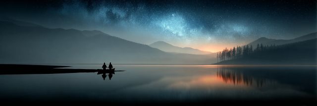 As twilight deepens into the velvet hues of night, the LA skyline silhouette unfurls against a cosmic tapestry ablaze with the Milky Way’s celestial glow. Two lone kayakers glide silently over a mirror-like lake, their forms echoing the tranquil symmetry of whispering pines lining the shore. This scene, set beneath a universe speckled with starlight, captures a moment of profound stillness and mesmerizing beauty. The distant hills roll softly into the darkness, bathed in the gentle luminescence of moonlight, crafting layers of shadow and light that dance across the visual plane. In the foreground, the calm waters of the lake reflect the myriad stars and the subtle gradient of night sky, creating an almost surreal dimension of depth and reflection. This artistic portrayal not only showcases a peaceful exploration but also evokes a sense of infinite possibility—as if the kayakers are navigating not just the tranquil waters but also the very essence of the cosmos. The deep blue tones of the night sky blend seamlessly with the darker silhouettes of the landscape, punctuated by the silvery sheen of the Milky Way and the serene glimmer of starlight on water. It’s a scene that inspires contemplation, inviting the viewer to pause and immerse in the quiet majesty of nature and the universe. This piece is a tribute to those fleeting, perfect moments when the world seems to hold its breath, and time pauses in homage to the awe-inspiring beauty of the night sky.