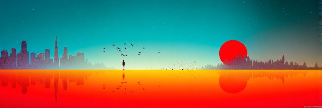 Enveloped in a luminescent glow, the San Francisco skyline emerges as a breathtaking motif positioned against a sky ablaze with vibrant hues of orange, crimson, and cerulean. The setting sun, oversized and deeply red, casts a mirror-like reflection on the serene waters, doubling the spectacle and emphasizing a moment of surreal stillness. In the foreground, a solitary figure gazes out towards this panoramic marvel, offering a poignant sense of scale and solitude in the vastness of nature's artwork. Birds, mid-flight, add a dynamic burst of life, traversing the line where water meets the fiery horizon. This piece is ideal for viewers who yearn to blend urban sophistication with the ethereal qualities of nature’s most dramatic moments. It’s an invocation of contemplation, a still point in the turning world where cityscape and dreamscape merge into one.