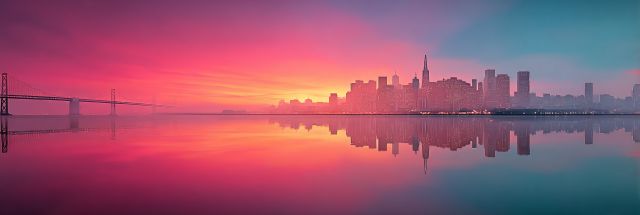 As the sun dips below the horizon, it casts a mesmerizing golden glow over the San Francisco skyline, capturing the essence of twilight in whimsical shades of rose and blush. Spread across the panorama are the iconic silhouettes that define this vibrant city: the elegant span of the Bay Bridge stretches across tranquil waters, leading the eye to a cluster of architectural marvels, punctuated by the slender grace of the Transamerica Pyramid. This exceptional canvas of natural and man-made elements plays out against a backdrop of a clear blue sky, fading into tender pinks and purples of the setting sun. The water underneath mirrors this spectacular vista in perfect symmetry, engulfed in the dusky hues and enhancing the magic of the scene. This stunning visual narrative not only highlights the urban beauty but also captures a fleeting moment of serene grandeur, offering a window into the city’s dual persona — bustling urbanity peacefully coexisting with sublime natural beauty.