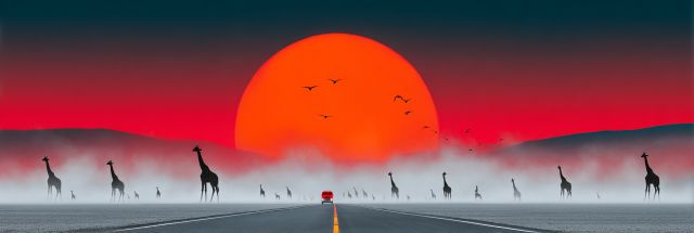 As the world dips into the hues of a setting sun, a mesmerizing scene unfolds on a seemingly infinite stretch of road. The horizon hosts an enormous fiery orb, its brilliant red and orange radiance casting a celestial glow that blankets the earth. This vivid backdrop is amplified by the delicate tendrils of mist that weave around the legs of statuesque giraffes. These gentle giants, silhouetted against the saturated sky, create a tableau that feels both otherworldly and serene. Each giraffe, poised with elegance, appears to traverse this mystical landscape slowly, their movements an ethereal dance. In the sky above, birds flutter softly, their wings cutting silhouettes against the sun's expansive glow, adding a layer of dynamic movement to the tranquil scene. This artwork is not just a depiction; it is an invitation to wander into a dream, a promise of peace that transcends the ordinary landscapes into something profoundly stirring. Engage with each element—the crisp, clear road marking that draws the eye forward, the surreal scale of natural elements, and the harmonious palette. This scene promises to ignite imagination and inspire awe with each viewing, as it beautifully merges the natural with the fantastical.