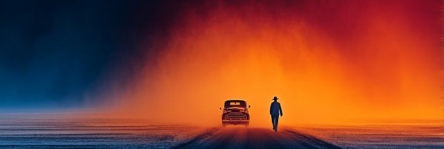 Enigmatic Journey at Dusk: A Visionary Road with Silhouetted Wanderer