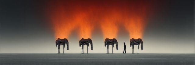 As the sun dips below the horizon, a surreal scene unfolds where the simplicity of the clear skyline collides with the complexity of emotion and imagination. Four colossal elephant silhouettes stand poised on an ethereal plain. Their towering forms, matched with the stark, minimalist landscape, evoke a sense of quiet majesty and poignant solitude. Above them, the sky erupts in a fiery spectacle of crimson and orange, reminiscent of the vivid hues of a desert sunset or perhaps the intense emotions of a distant festival, like one may witness at Burning Man. The shadowy figure of a lone wanderer moves among these gentle giants, a tiny yet poignant presence amidst the overwhelming grandeur of nature and the haunting enormity of the elephants. This visual metaphor might speak to the viewer of companionship, guidance, or perhaps the bold journey of self-discovery that calls to the brave. The untouched ground beneath their feet, expansive and smooth, mirrors the vast possibilities of the mind's landscape when set against the challenges and beauty of the natural world. This art piece is not just a view but an experience, inviting the observer to dwell in the depths of their emotions and the wilds of their imagination.