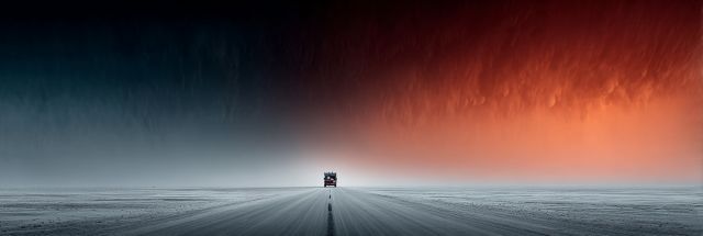 Enveloped in a mysterious aura, a lone vehicle traces its path across a vast, barren landscape, under a dramatic sky that graduates from a deep, dark blue into fiery shades of red and orange. As if painted with the brushstrokes of a surrealist, the scene invites viewers into a world that transcends the ordinary—a place where the road signifies not just a physical journey but also a voyage into the depths of one's soul. The sharp contrast between the darkened ice-like ground and the blazing sky evokes a feeling of solitude and introspection, making the viewer ponder the dualities of light and darkness, motion and stillness. This piece captures the essence of exploration, not only of external spaces but also internal realms, offering a visual saga that resonates with anyone who beholds it. The artwork, while minimalistic, is charged with emotion, the vehicle and its solitary journey serving as a metaphor for life’s travels, and the choices one makes on their personal path to the unknown.