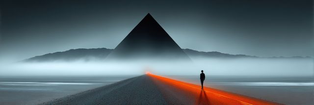 Bathed in a ghostly mist, an otherworldly scene unfolds as a lone traveler treads a vivid, neon-lit path towards an immense, shadowy pyramid. As the soft haze dances with the echoes of twilight, the radiance of the path casts an eerie glow, illuminating the figure with an intense orange light that slices through the pervasive fog. This surreal landscape merges the familiar with the fantastical, evoking a sense of boundless mystery and an invitation to explore the unknown. The stark silhouette of the pyramid, monumental and enigmatic, dominates the horizon, its pointed apex piercing the somber heavens like a beacon of ancient stories untold. The journey depicted is silent yet powerful, pulling viewers into a narrative that is both personal and universal—a contemplation of life’s journeys and the destinations we aspire to reach. This image, blending elements of solitude, wonder, and anticipation, encapsulates a moment of profound introspection amid a dreamscape that transcends time and place.