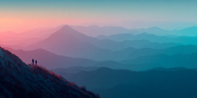 As twilight casts its tranquil spell over the rolling landscape, two hikers pause on a rugged mountain path, the San Francisco skyline a distant silhouette against the cooling sky. This canvas captures a moment of serene contemplation, where nature's grandeur and urban elegance converge in a sublime visual symphony. The layered hills, bathed in shades of blues and purples, whisper of mysteries held in the fading light, their contours softly blurred as if brushed by an artist's hand. The minimalist yet impactful approach of geometric abstraction brings out the earthy tones and the simplicity of the open space. Moreover, the presence of the hikers adds a human element, suggesting stories untold and journeys yet to complete. This artwork not only decorates a space but also invites the viewer to linger within its depths, exploring the interplay of light, shadow, and color that transforms with each viewing.