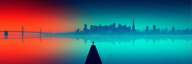 As dawn surrenders to the first light of twilight, the iconic Houston skyline emerges from the cool mists of an imaginary realm reminiscent of Burning Man's surreal artistry. In this visually arresting canvas, the familiar structural outlines of Houston are intertwined with the fantastical elements of underwater sea life, a vivid representation brought alive in the shades of a jellyfish. This juxtaposition invites the viewer into a world where the natural and urban environments merge. The horizon bleeds into fierce oranges and serene blues, creating a gradient that mimics the ocean’s own sundown palette. In the forefront, a lone figure stands at the pinnacle of a pyramid-like structure, gazing upon the magnificence, possibly pondering the tranquil yet dynamic fusion of nature and human ingenuity. This piece brilliantly encapsulates a sense of vastness and introspection, making the viewer feel both insignificant in the grandeur of the universe yet deeply connected to the forms that define our existence.