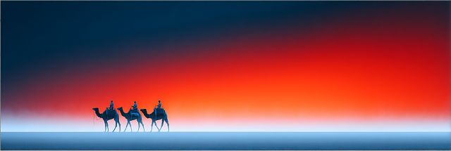 As dusk descends upon an endless horizon, three silhouetted camels and their riders traverse the boundary line between reality and reverie, moving through a landscape that blurs into the ethereal realms of dreams. This arresting tableau unfolds under a sky ignited by a deep, burning crimson transitioning into a soothing blue, mirroring perhaps the fiery heat of day cooling into the calm of twilight. The stark contrast between the calm, dark figures and the vivid sky creates a mesmerizing visual symphony. This imagery, reminiscent of scenes from distant lands and ancient caravans, evokes a sense of peaceful progression amidst a world ablaze. The camels, poised with grace, carry their riders with a steady, deliberate pace, reflecting resilience and an unhurried journey through time and space. This print captures not just a mere moment but a timeless voyage, inviting the observer to ponder the quiet stories carried in the silent shuffle of sandy hooves.