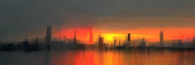 *** About Urban Skylines: Urban skylines not only define the aesthetic of a city but also embody its spirit and progress. They tell stories of architectural ambition, cultural shifts, and the bustling life of its inhabitants. As the sun rises and sets over these towering structures, their silhouettes create a dramatic interplay of light and shadow, which has captivated artists and photographers alike. This artwork encapsulates such mesmerizing visuals, providing a snapshot of urban vitality in its most serene moments.