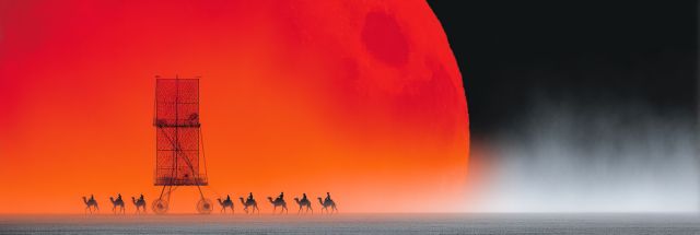Amidst the vast, orange-hued expanse, an epic scene unfolds in profound elegance and mystery. A radiant, oversized sun dips toward the horizon, painting the sky in fiery shades of red and orange, projecting a surreal backdrop that feels both alien and mesmerizing. Silhouetted against this dramatic skyscape, a string of camels march uniformly across the desolate terrain, embodying a sense of timeless migration. In stark, yet harmonious contrast, a peculiar tower-like structure pierces the landscape, its intricate and geometrical form standing as a sentinel over this silent procession. Each element in the frame contributes to a narrative that whispers tales of journey and discovery, of surviving in vast and open emptiness where every step tells a story of resilience and emblematic beauty. As the dust swirls and the cool tones of ground seem to blend into the mist, viewers are drawn into a dream where nature and human-made wonders coalesce effortlessly. This enchanting tableau captures the imagination, inviting onlookers to delve into a realm where the laws of nature and human ingenuity collide in captivating harmony.