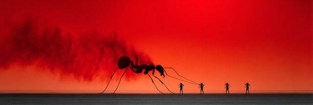 Amid a landscape bathed in an otherworldly red hue, a colossal silhouette of an ant dominates the horizon, casting a long shadow over the sandy terrain. This striking image merges the minuscule with the magnificent, portraying a surreal scene where tiny ants orchestrate a cosmic dance. The stark contrast between the fiery sky and the deep silhouettes captivates the viewer, inviting them into a world where the ordinary becomes extraordinary. As if attendees of a desert festival, miniature human figures stand beneath the towering form, dwarfed yet integral to this grand spectacle. The scene is reminiscent of fables and folklore, where creatures of the earth hold secrets of the universe in their delicate forms. The vivid red sky, textured with smoky whispers of clouds, resembles the passionate strokes of an expressionist painter, evoking emotions ranging from awe to introspection. The artwork challenges perceptions, asking the viewer to contemplate our role in the vast tapestry of existence.