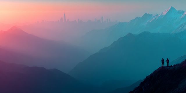 As dawn breaks, the serene silence of a mountainous landscape is softly broken by the distant hum of a waking city. In this breathtaking depiction, two hikers stand poised on a rugged cliff, their figures silhouetted against the vibrant hues of a morning sky. Below them, layers of mountains cascade into the mist, each ridge a deeper shade of twilight blue, leading the eye toward the faraway Chicago skyline. The city, though miles away, is visibly buzzing with the early lights of skyscrapers piercing through the morning fog, casting a promise of the busy day ahead.