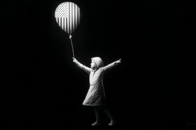 In an evocative display of contrast and symbolism, the artwork presents a solitary figure clad in simple attire, stretching her arms wide as if to embrace a world unseen. Her delicate grasp on a balloon, which intriguingly bears the pattern of the American flag, depicts both a celebration and a critique of the ideals for which it stands. This monochrome composition booms in silence against a stark black background, where only the subject and her symbolic balloon occupy the frame, crafting a powerful statement on identity, dreams, and national resonance. The minimalistic style underscores the potency of the message, making each viewer ponder the weight of freedom and the pursuit of happiness. With the balloon symbolically lifting upwards, one might interpret it as an aspiration towards higher ideals and the eternal struggle between grounding reality and lofty aspirations. Every element, from the flag’s stripes and stars to the posture of the figure, is crafted with meticulous detail, steering the audience through a visual journey bound by metaphorical richness. This art piece speaks volumes about the subtleties of personal and collective expression, making it a profound commentary on modern society’s intricate dance with liberty.