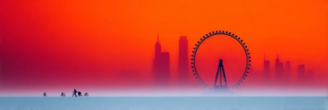 Bathed in the warm glow of a fiery sunset, the ethereal backdrop of San Francisco’s iconic skyline lends a surreal charm to this enchanting canvas. The intensity of the orange sky, suffused with dusk's embers, seems to set the city afire, evoking a feeling of both wonder and mystique. Silhouetted against this dramatic vista, a group of cyclists travels along a serene, glass-like waterline, their figures a dance of shadows in the burning twilight. The depiction is poetic, with the great Ferris wheel towering high, symbolizing dreams and aspirations reaching towards the sky. The soft, smooth gradient of the horizon transcends into the calm blues, providing a cooling counterbalance to the sky’s hot spectrum. This artwork merges the natural with the crafted, where man's achievements and nature's beauty meet in a silent dialogue that speaks volumes about persistence, peace, and the everyday cycle of life. Savor the juxtaposition of serene motion against a static explosion of color, a symbolic narrative captured in the tranquil yet dynamic moments of twilight.