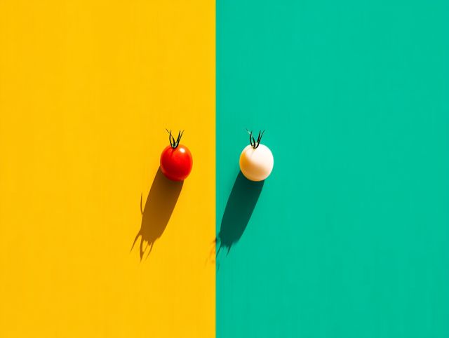 Dive into a world of stark contrasts and bold simplicity with this captivating artwork. A vivid red tomato and a pristine white egg sit boldly against a split background of vibrant yellow and rich turquoise, each casting a soft, elongated shadow that adds a touch of depth and intrigue. This piece, utilizing a minimalistic retro pop art style, echoes the mid-century modern aesthetics by stripping the visual narrative down to its most fundamental elements: shape, color, and light. The decision to place these everyday items in such a stylized context transforms the ordinary into something extraordinary, provoking thoughts about the beauty and artistry found in daily life. The use of flat design techniques alongside high-contrast lighting enhances the textures usually unseen in such simple subjects. As the colors clash, so do the interpretations — is this a commentary on natural versus artificial, or perhaps an exploration of dietary contrasts? The artwork invites the viewer to ponder its purpose, all the while delighting the senses with its playful execution and crisp, clean lines characteristic of modern illustration styles.