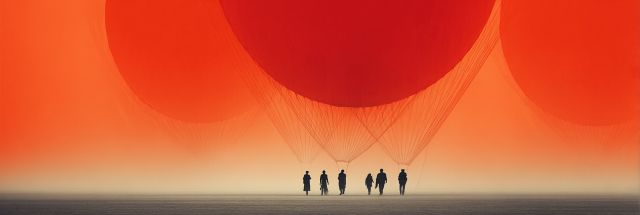 Amidst the vast silence of the desert, a stirring image emerges, capturing the essence of an otherworldly expedition beneath the embrace of mammoth crimson spheres. Enveloped in an atmosphere tinged with mystery and anticipation, figures proceed along the endless expanse, cast as silhouettes against the luminous contours of this surreal landscape. The sheer scale of the glowing orbs contrasts starkly with the diminutive human forms, a visual metaphor for the immensity of nature and our own transient passage through time. The meticulous arrangement of these celestial-like bodies, radiating with a fiery glow, evokes a scene from a dream or a distant memory.