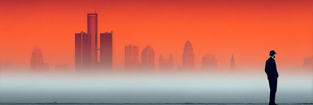 Fiery Horizon: Detroit Skyline and Silhouetted Figure in Mist