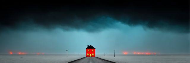 Draped under brooding storm clouds, a vividly illuminated house stands alone amidst a stark, awe-inspiring landscape, defining resilience and solitude in a single frame. The deep hues of an angry sky threaten with an unseen ferocity, while the horizon burns with a calm yet unsettling red glow, reminiscent of distant wildfires or a landscape caught in the twilight of an eclipse. This spectral vista cuts a dramatic swath through the tranquility of the scene, the roadway leading the eye directly to the enigmatic red house, alive with light against all odds. Beyond, the subdued fire of the horizon stretches, suggesting a world pulsing with undying energy and ceaseless change. Visually arresting and emotionally stirring, this piece encapsulates a moment suspended between chaos and calm, inviting the viewer to ponder the narratives that such a scene provokes. The stark contrasts and playful illumination beguile the senses, making you circle back to look yet again, finding new layers and meanings with each perusal.