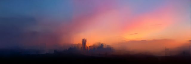 Nestled within a glorious haze of dawn, the blurred silhouette of a city emerges as if from a dream. The canvas displays an urban skyline softly enshrouded in shifting veils of mist and light, inviting viewers into a realm of quiet contemplation. The horizon is tinged with a rosy hue wherein splashes of coral, lavender, and deep blue merge into a celestial dance, creating a visage that speaks both of tranquility and the bustling life hidden beneath its pastel shroud. The skyline, subtly outlined against the awakening sky, suggests notable skyscrapers veiled behind nature's gentle filter, resonating with the sleepy murmurs of a city stirring to life. As the light slowly ascends, the boundaries of architecture and atmosphere blur, crafting a view that is less of a stark cityscape and more of a soft, impressionistic painting crafted by time and light. This artwork effortlessly captures the brief moments where the night's mystery meets the promise of the new day, wrapped in a palette that boasts not only of a vision seen but of emotions felt. Each gaze upon this piece may transport one to those serene mornings where the world appears renewed, offering a quiet hope and a gentle start.