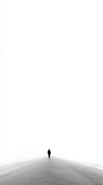 Amidst a boundless expanse of white, a lone figure advances, an enigmatic presence encapsulated in the timeless realm of monochrome. The photograph’s stark simplicity reveals a world stripped to its essence, where every line and shadow holds purpose, its narrative sculpted by the interplay of darkness and overwhelming light. The uncluttered composition emphasizes the solitude of the figure, a stark silhouette against an infinite canvas of white, creating a palpable tension between presence and void. This image eloquently speaks to the human condition—our universal journey through the landscapes of isolation and introspection. Contrasting textures subtly define the scene; the soft, ethereal quality of the misty backdrop juxtaposes sharply against the crisp, clear lines that delineate the solitary wanderer. The vastness of the white space acts not just as a setting but also as a character in its own right, its silence reverberating with unsaid thoughts and uncharted dreams. The emotional resonance of the image lies in what is absent as much as in what is present, inviting the viewer to delve into their own experiences of solitude, reflection, and the quiet courage of stepping into the unknown. Each observer is thus invited to impose personal nuances upon this visual poem, making the experience of viewing not just collective but also deeply individual.