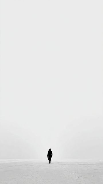 In a world constantly buzzing with activity, the rare depiction of silence can be profoundly moving. This image embraces such a moment, presenting a lone figure engulfed by an expansive white canvas. As the subject walks into the infinite, there is a palpable sense of journeying toward the unknown. The use of black and white intensifies the feeling of isolation, stripping away the distractions of color and reducing the scene to its most essential elements. The figure, small and centered, serves as a poignant reminder of humanity's sometimes solitary nature. The vastness around suggests both freedom and confinement, an expanse that beckons yet overwhelms. Each step taken by the figure resonates with the viewer, evoking personal memories of solitude or moments of introspection. This image, subtle yet powerful, invites the observer to ponder their path and the spaces they navigate, both physically and emotionally. It reflects the beauty and melancholy of solitude, making it a compelling piece not just to view, but to experience.