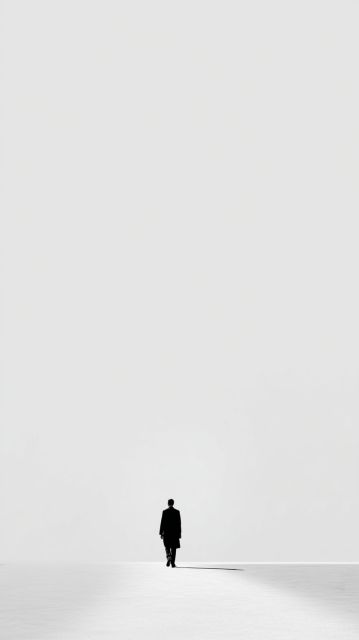 As you gaze upon this compelling image, feel the palpable stillness of the scene where a lone figure ambles across an expansive white canvas. The starkness of the white background contrasts profoundly with the dark silhouette of the walker, etching a visual narrative rich in solitude and introspection. This composition masterfully plays with the concept of space and presence, where the absence of clutter amplifies the emotional gravity of the lone figure's journey. There's a haunting beauty in the simplicity of the scene—every element is reduced to its essence, creating a powerful statement on isolation and the human condition. The minimal detail draws the viewer's focus exclusively to the subject, making every step of the figure not just a movement through space, but a deeper exploration into the vast terrains of one's own thoughts. The high horizon line and the slight shadow cast by the figure stir a subtle drama, elevating the ordinary act of walking into a metaphor for life's broader journeys. This piece invites the observer to pause and reflect, offering a mirror to their own experiences of solitude, resilience, and the quiet strength that comes from facing vast, open emptiness. As much as it is an artwork, it is also a meditative tool, urging one to look within through its display of stark external minimalism.