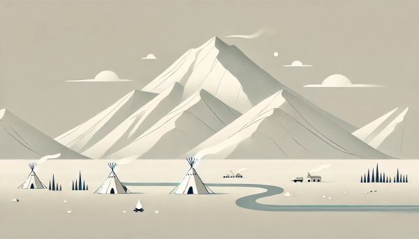 This captivating work of art presents a stylized portrayal of Denali, the tallest peak in the United States, through a serene and minimalistic landscape. The foreground includes simple yet evocative representations of a Native American village with traditional tepees alongside a meandering river, which adds a sense of tranquility and historical context. With muted tones and a stark contrast between the snow-covered mountains and the sparse vegetation, this illustration merges natural grandeur with cultural homage, making it ideal for both educational and decorative purposes.
