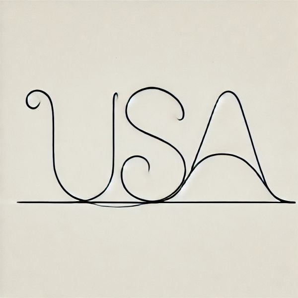 This artistic image presents a captivating minimalist design, where the word 'USA' is elegantly drawn with a single, continuous line. In this creative representation, the end of the letter 'U' seamlessly transitions into the 'S', which then flows gracefully into the 'A', encapsulating a smooth and flowing aesthetic. The simplicity of the black line against a clean, off-white background enhances its visual impact, making it an ideal choice for modern wall decor or a symbolic piece in a patriotic collection. This artwork effortlessly combines artistry with national pride.