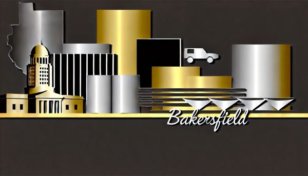 This eye-catching wall decor presents a futuristic vision of Bakersfield, utilizing a sophisticated palette of black, gold, and silver. The composition features a streamlined interpretation of the city's skyline, highlighting key buildings and architectural elements with a clean, modern aesthetic. Bold metallic colors give the artwork a unique vibrancy, while the detailed silhouette of an iconic building adds a touch of realism to the abstract design. Perfect for contemporary urban interiors, this artwork encapsulates the essence of Bakersfield in a stylish, minimalist format.