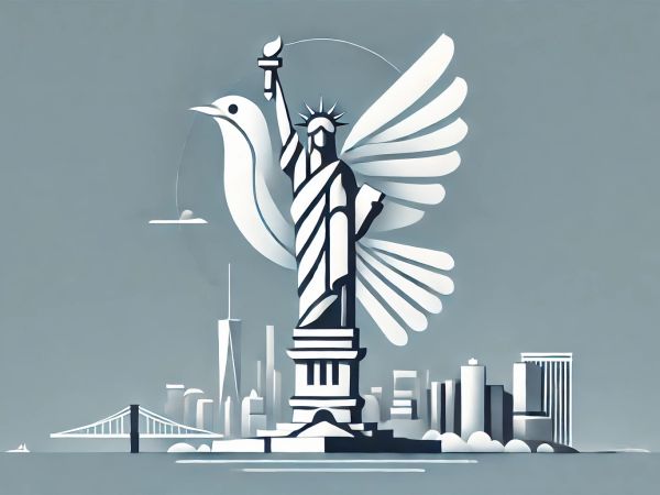 This artwork presents a stirring and minimalist design, meshing the iconic Statue of Liberty with a dove, symbolizing peace and unity. Set against a subdued blue background, the composition cleverly combines the features of Lady Liberty with the soft, flowing lines of a dove in flight, presenting a poignant message of harmony. The New York skyline, including notable structures like skyscrapers and the bridge, is subtly blended into the background, tying the elements together into a seamless unity of ideals and architecture.