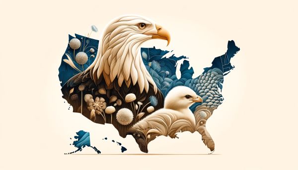 Patriotic Artwork Featuring Bald Eagles and USA Map Silhouette
