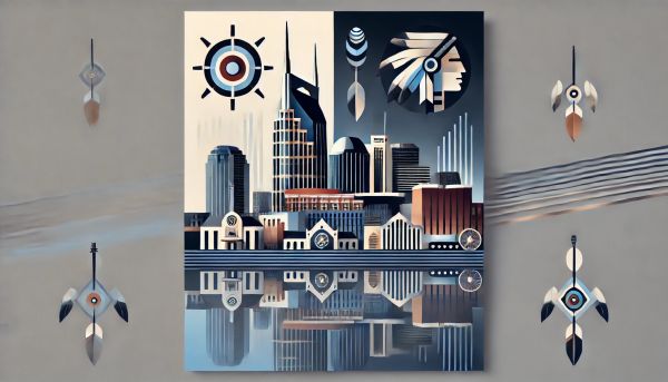 This art piece presents a contemporary fusion of Nashville's city silhouette with Native American symbols, offering a fresh perspective on cultural integration. The minimalist approach emphasizes clean lines and uses a soft color palette to enhance the metropolitan architecture seamlessly blended with indigenous motifs. Reflections of the structures in the surface below suggest a thoughtful consideration of the city's historical layers and cultural depth. This compelling piece serves not only as decor but also as a narrative canvas illustrating the harmony between urban modernity and traditional heritage.
