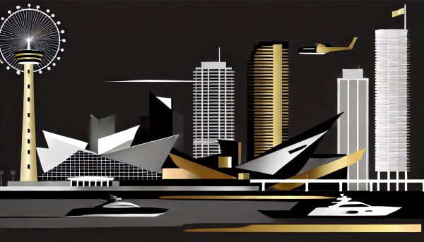 This captivating artwork presents a futuristic and abstract representation of Miami, portrayed in striking black, metallic gold, and silver shades. The composition is minimalist yet dynamic, highlighting iconic architectural elements and abstract forms that suggest the vibrant cityscape and its technologically advanced vision. Notable are the stylized interpretations of major landmarks and skyscrapers, interspersed with geometric shapes and patterns that evoke a sense of movement and energy. The use of light and shadow, along with the selective color palette, creates a compelling visual narrative that is both modern and timeless.