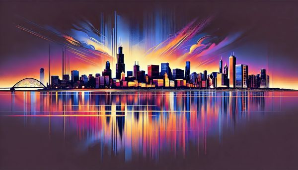 Neon Glow and Dusk Hues: Abstract Chicago Skyline Art Print
