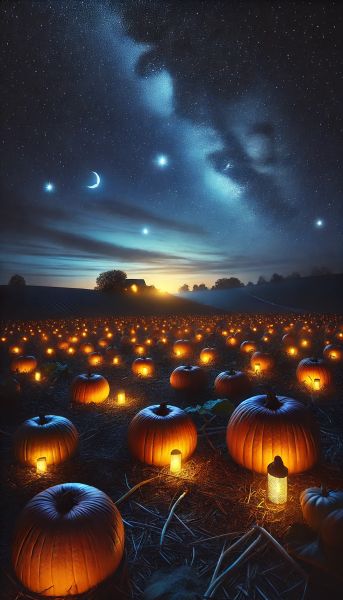 In this mesmerizing image, a twilight scene unfolds over a sprawling pumpkin patch, capturing the essence of a serene autumn evening. As the sun sets below the horizon, the sky transforms into a canvas of deep blue and purple hues, adorned with twinkling stars and a crescent moon. Each pumpkin is gently illuminated from within, casting a warm glow that contrasts with the cool night sky. The presence of a solitary lantern adds to the atmosphere, creating a sense of tranquility and mystique in this enchanting autumnal setting.