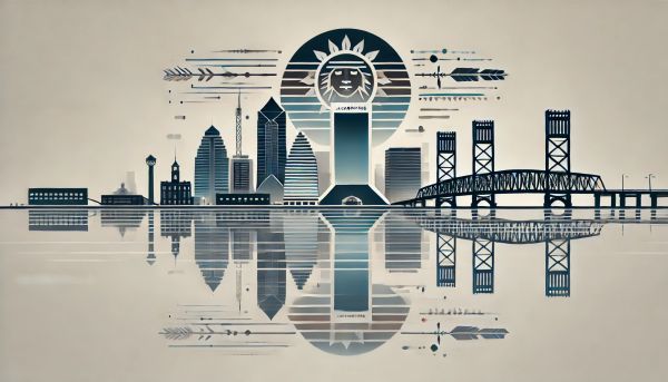Jacksonville Cityscape with Native American Symbols and Lightbulb Motif