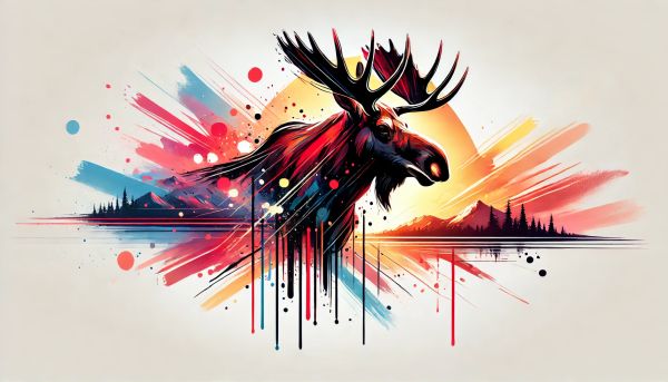 Dynamic Moose Artwork with Vibrant Landscape and Paint Drips
