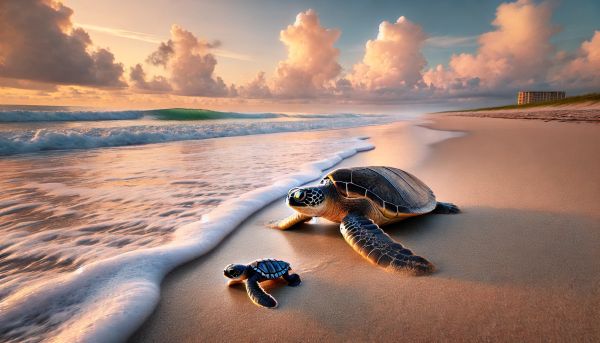 This captivating image beautifully captures the early moments of a loggerhead sea turtle hatchling's life on a serene Florida beach. As the first light of dawn colors the sky, a mother turtle guides her young toward the vast ocean, their journey unfolding on soft, sandy shores. The image portrays the delicate yet enduring nature of sea turtle life, emphasizing themes of survival and the mother-child bond. The majestic ocean waves and the distant coastal vegetation frame this poignant scene, highlighting the natural beauty and vulnerability of this endangered species.