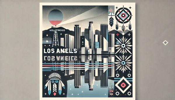 This artistic interpretation showcases the dynamic Los Angeles skyline as its central theme, blending modern architectural elements with traditional Native American symbols. The print uses a minimalist style, employing a soothing color palette that includes cool blues, grays, and touches of warmer hues. Signifying cultural fusion, iconic buildings are arranged alongside motifs like the Native American chief, arrows, and geometric patterns, suggesting a deep respect and integration of Native history with the city's modern identity. The inclusion of the Hollywood sign injects a quintessential L.A. vibe, making this piece a unique wall decor choice for any modern space.