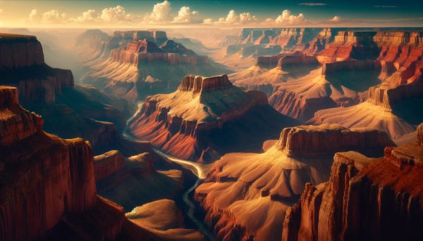 This captivating image showcases a sunset view over the Grand Canyon, highlighting the unique geological features that have made it a natural wonder. The photograph is taken in a wide format, emphasizing the expansive vista and intricate layers of rock that cascade into the depths of the canyon. Warm hues paint the scene, as sunlight bathes the rugged terrain in golden and red tones, creating a dramatic contrast with the deep shadows in the crevices. This image not only captures the raw beauty of the Arizona landscape but also invokes a sense of awe and timeless majesty.