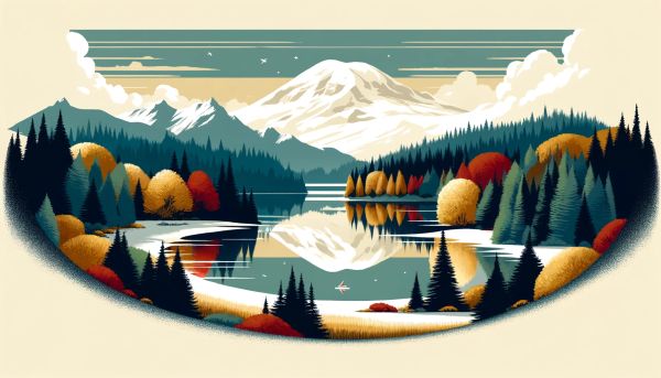 This captivating image offers an artistic representation of Mount Rainier, set in a serene landscape that beautifully marries the essence of fall and winter. The artwork features striking contrasts between the warm golds and oranges of autumn foliage and the pristine whites of winter snow. The calm lake reflects the mountain majestically, surrounded by a forest of evergreens and deciduous trees that are mid-transition, enhancing the natural splendor of the scene. This minimalist yet rich depiction makes it an ideal piece for anyone looking to bring a touch of nature's tranquility and the beauty of Washington State into their living space.