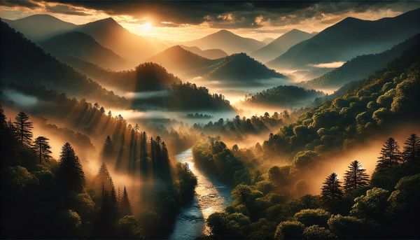 This breathtaking image captures the serene beauty of sunrise over the Great Smoky Mountains National Park. The sun's first rays peek through the mountain peaks, illuminating the mist that gently envelops the lush, verdant forests. A river gracefully meanders through the valley, reflecting the golden hues of the morning light. This scene, symbolic of tranquility and untouched nature, is a powerful representation of one of America's most cherished national parks, perfect for any wall decor aiming to bring nature's calm into a home or office.