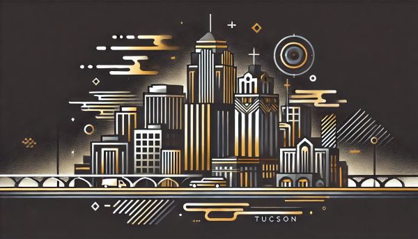This striking art print showcases a futuristic interpretation of Tucson's skyline, illustrated in a sophisticated palette of black, gold, and silver. The piece skillfully blends traditional architecture with modern elements, emphasizing sharp, clean lines and abstract geometric shapes. Distinct features like textured buildings and stylized embellishments add depth and intrigue. Perfect for modern decor, this artwork captures the essence of Tucson while projecting a sleek, futuristic vibe. It's an eye-catching statement piece that adds a touch of elegance and contemporary style to any space.