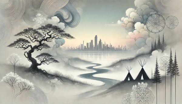 This artwork merges the tranquil aesthetics of Japanese Ink Wash painting with a minimalist depiction of San Francisco's skyline. The scene is set in a serene, mystical landscape, where a sinuous river meanders through a misty forest, leading the eye towards the distant cityscape. An ancient tree, exquisitely detailed, anchors the composition on the left, balancing the urban silhouette. Ethereal clouds and geometric patterns add a surreal touch to the vista, evoking a sense of calm and wonder. This piece perfectly captures the harmony between urban development and natural beauty.